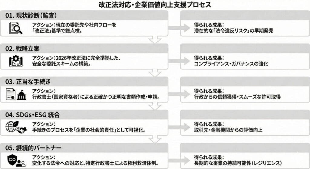 | デジタル対応 | 電子申請において、委託先が貴社のID/PWを借りて「本人になりすまし」ていないか。 | 【NG】 代理送信は行政書士の職権が必要 |