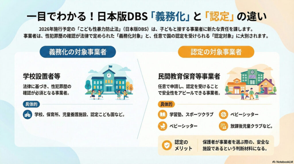日本版DBS制度は、事業者を大きく「義務化対象」と「認定対象」の二つに分けています。
