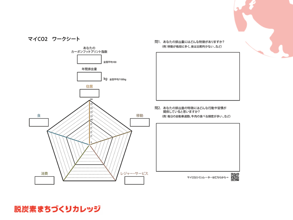 - 個人の排出量の見える化と振り返り、「移動」「住居」「食」などの様々な領域での排出量を削減するた めのプロジェクトを企画・具体化するデザインワークを行う。