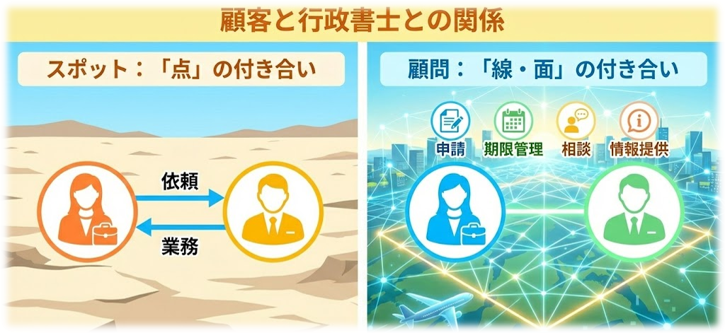 月額顧問料をいただく代わりに、申請報酬の特別割引や、電話・LINEでの相談、優先的なスピード対応をお約束します。