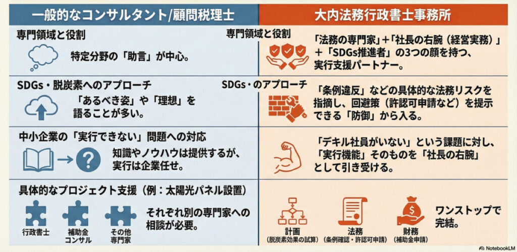この3要素を融合させることで、「構想(コンサル)から、許可・資金(行政書士)、社内定着(ファシリテーター)まで」をワンストップで提供できるのが最大の違いです。