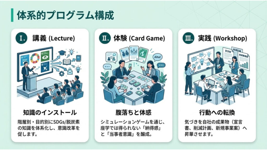 座学(Lecture)で得た知識を、カードゲームによる「没入空間」で心理的安全性を担保しつつ「納得感」と「行動変容の起点」に転換させる高い再現性が期待できます。
