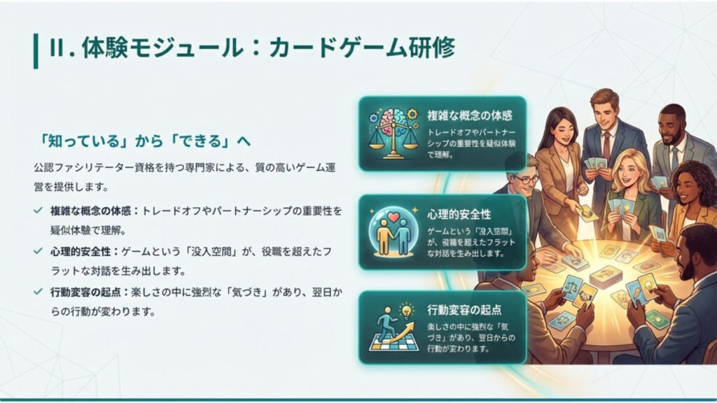 公認ファシリテーターが運営するカードゲーム(体験モジュール)を通じて、複雑な概念(トレードオフ、パートナーシップ)を擬似体験。ゲームによる「没入空間」は役職を超えたフラットな対話と心理的安全性を生み出し、「楽しさの中にある強烈な気づき」を行動変容の起点にします。