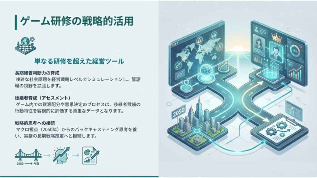 2050年からのバックキャスティング思考を養成し、実務の長期経営戦略に接続。ゲーム中の資源配分や意思決定プロセスは、後継者候補の客観的評価データにもなります。