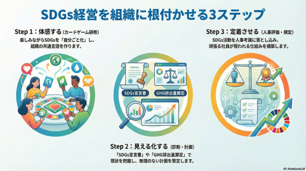 社員の「やらされ感」を払拭。楽しみながらSDGsを「自分ごと化」し、組織の共通言語を作ります。